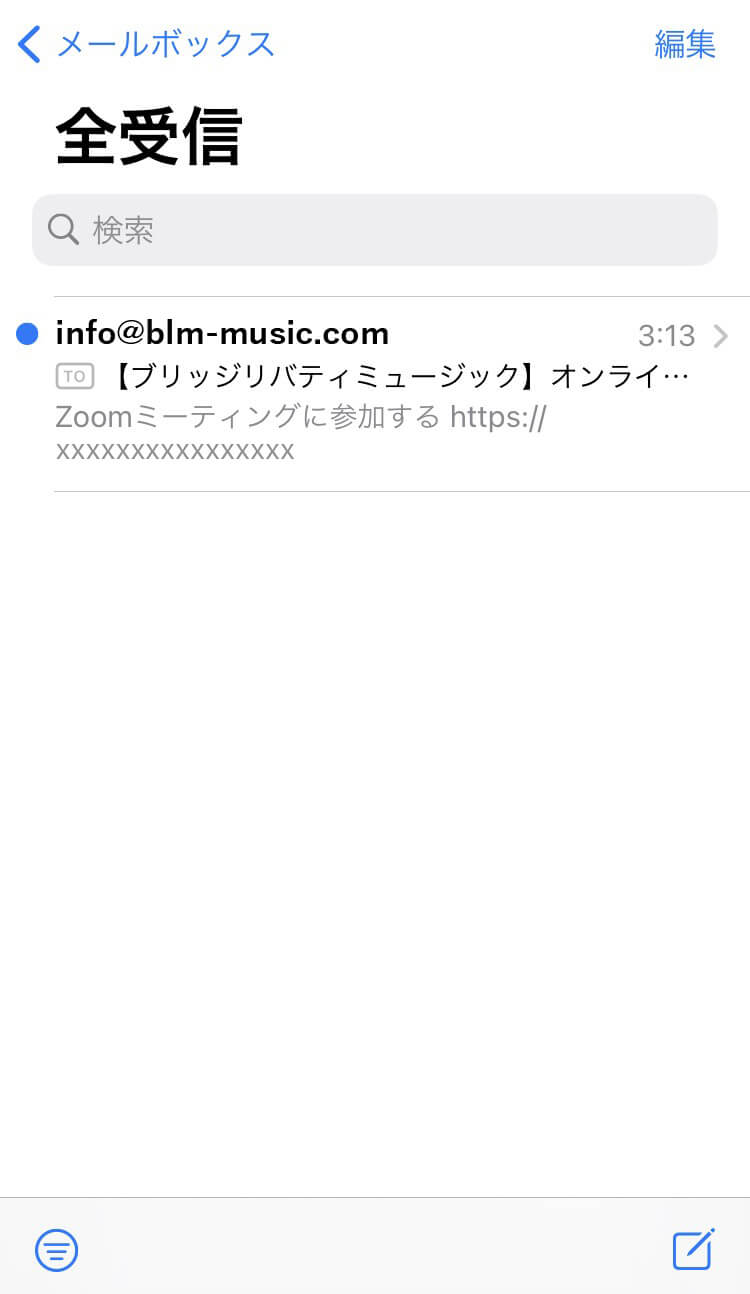① 定刻になりましたら、お申込み時にお送りいただいたメールアドレスへ「【ブリッジリバティミュージック】オンラインレッスンに参加してください。」という件名で、教室からzoomの招待をお送りします。