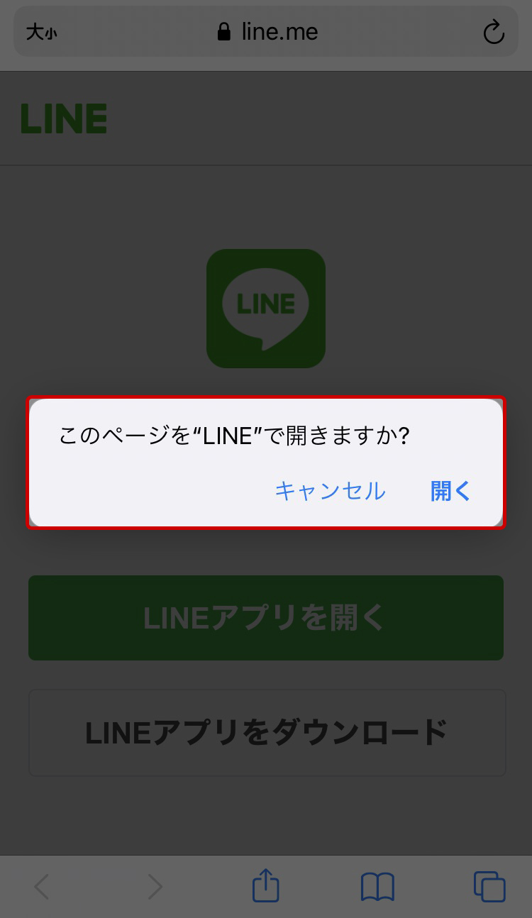 ③ 「このページを"LINE"で開きますか?」と聞かれるので「開く」を選択してください。